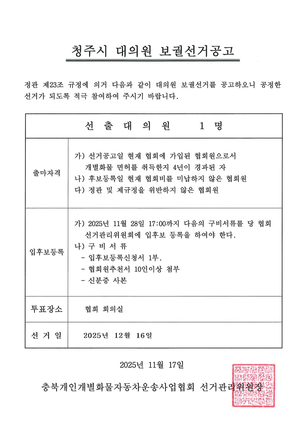 2025년 청주대의원 보궐선거 공고문